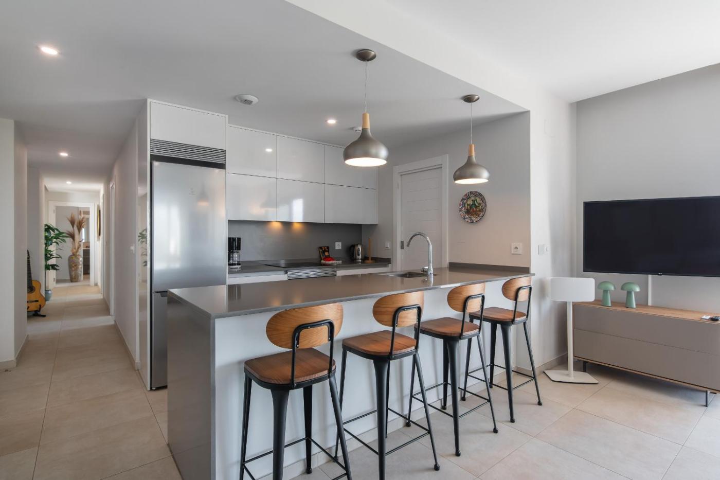 El apartamento cuenta con 3 dormitorios, una cocina con nevera y lavavajillas, y 2 baños con ducha, secador de pelo y lavadora. Hay toallas y ropa de cama en el apartamento.