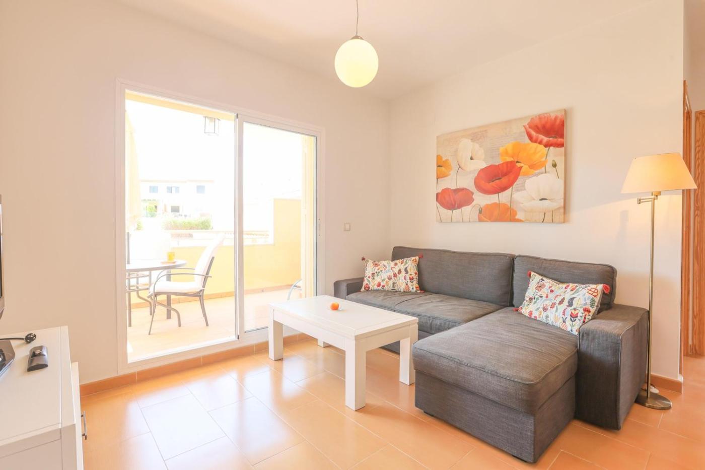 El apartamento cuenta con terraza y vistas a la piscina, y dispone de 2 dormitorios, una sala de estar, TV, una cocina equipada con nevera y lavavajillas, y 1 baño con bidet. Hay toallas y ropa de cama en el apartamento.
