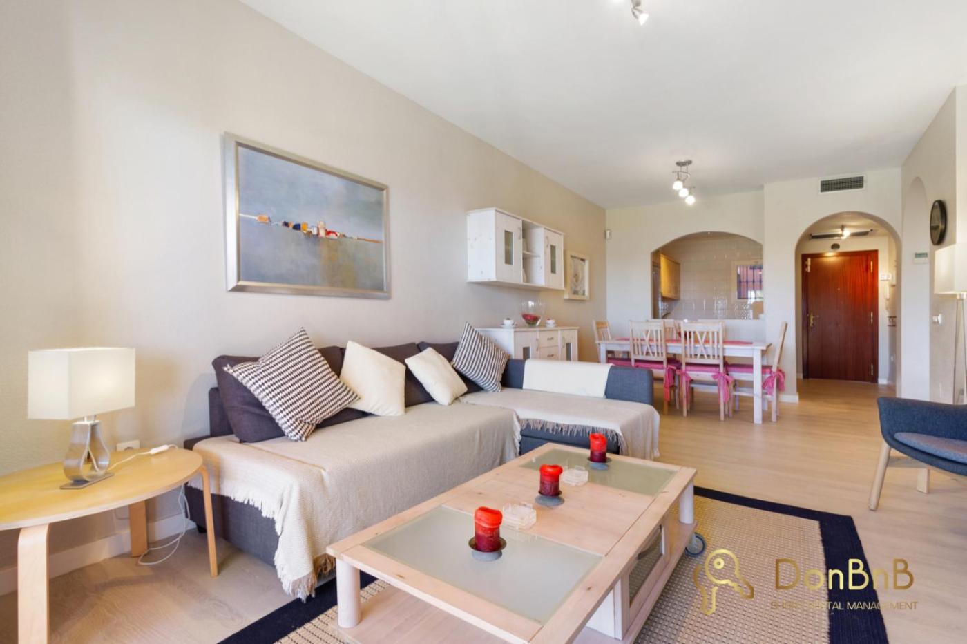 El apartamento cuenta con 2 dormitorios, 2 baños, ropa de cama, toallas, TV de pantalla plana, zona de comedor, cocina totalmente equipada y terraza con vistas al mar.